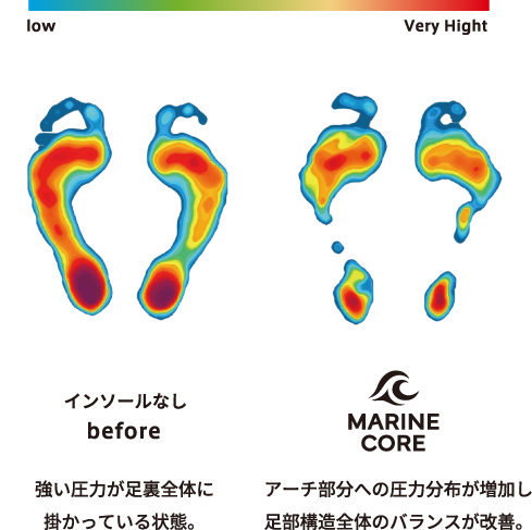 足裏の圧力分布を高精度に測定できる専用機器を用い、MARINE COREのインソールを装着する前と後での「立位時の重心バランスの変化」を検証しました。可視化されたデータでは、体重の偏りが整い、足裏全体に圧力がより均等に分散されていることが確認されました。身体は無意識のうちに正しい重心バランスへと導かれていることが、予想できます。